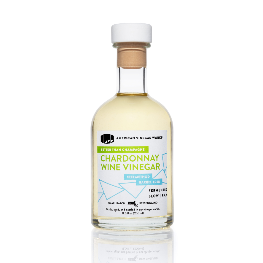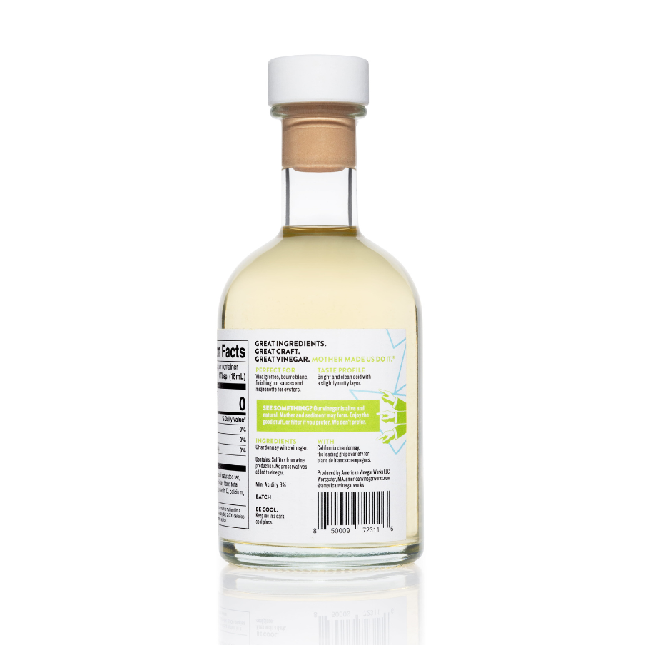 Better Than Champagne Chardonnay Wine Vinegar starts with California chardonnay, slow-fermented in small batches using an early-1800s method, then rested in 25-gallon American oak. The result is feather-light, bright, and polished—like a champagne blanc de blancs vibe, only vinegar, and honestly better for the kitchen.