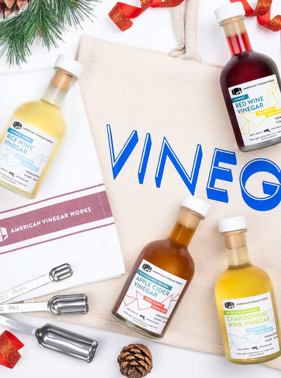 Includes four full sized glass bottles ( 8.5 oz/250ml) of our small-batch, barrel-aged vinegars.