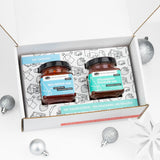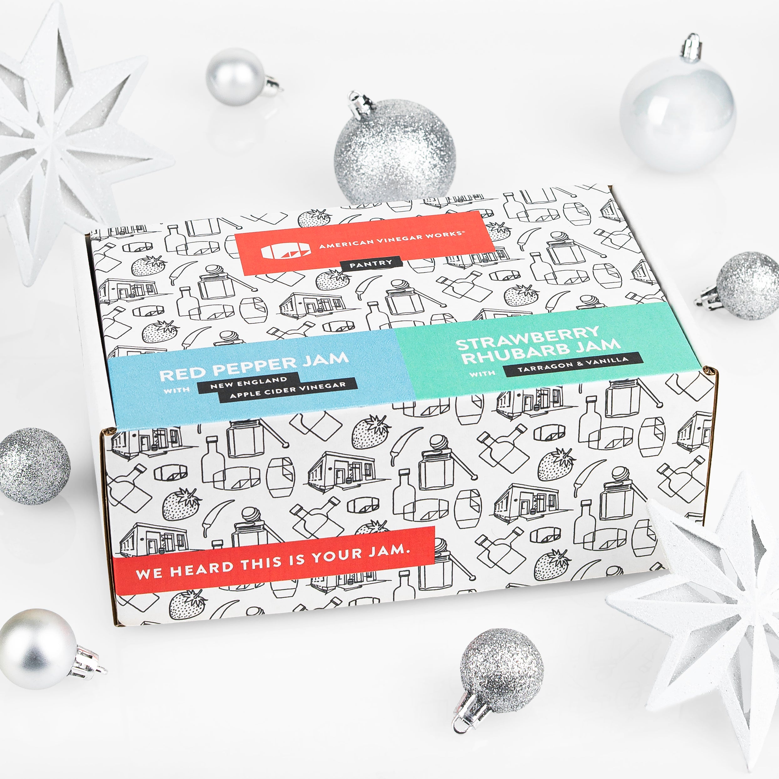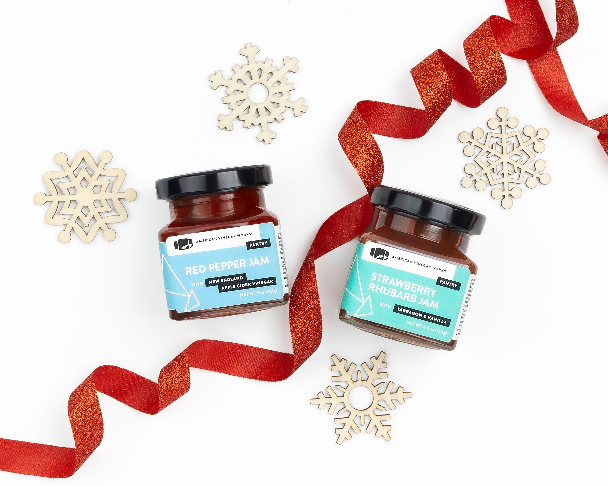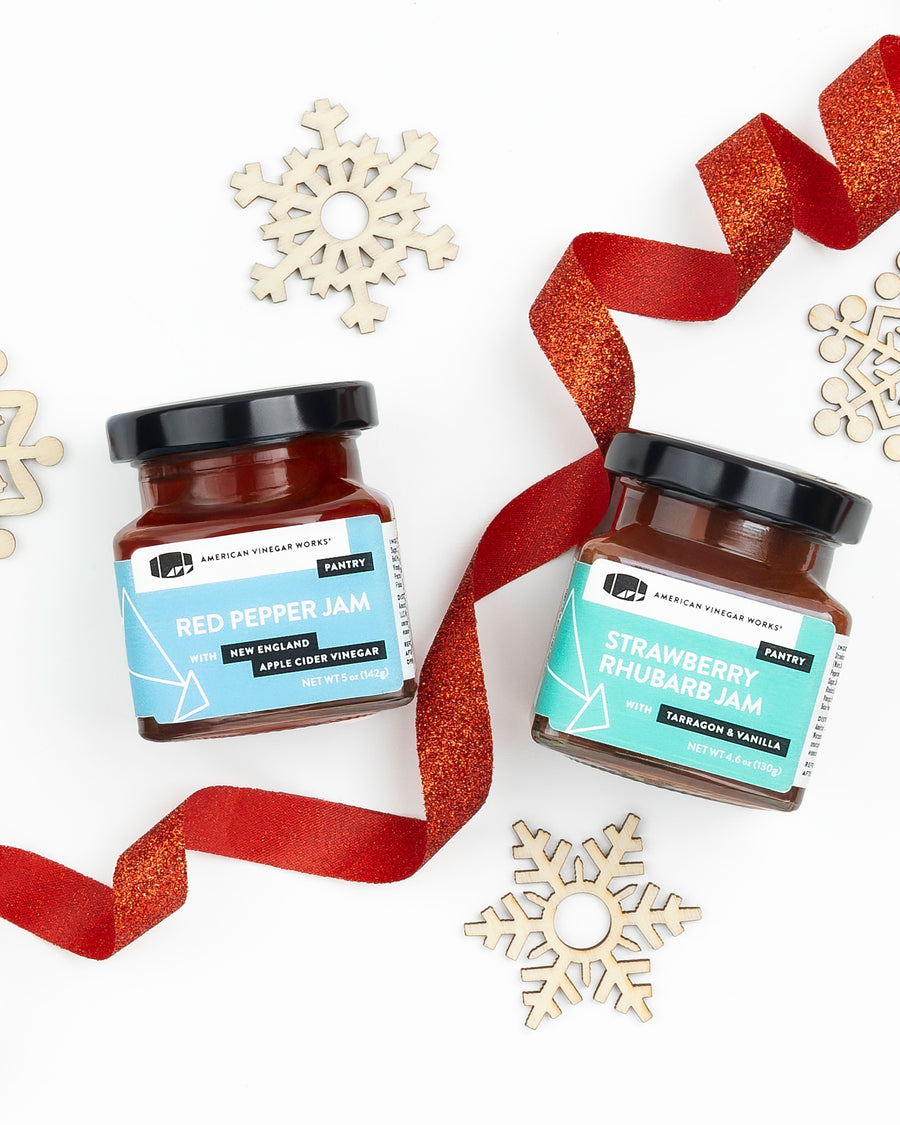 Jam gift set with two jams in custom gift box. Strawberry Rhubarb with Tarragon and Vanilla. Red Pepper Jam with New England Apple Cider.